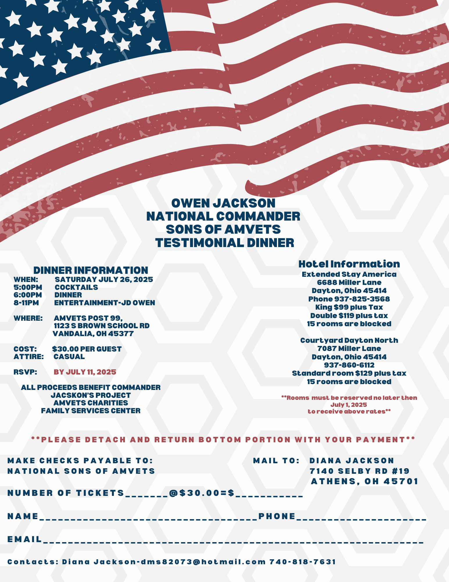 Join the National Sons of AMVETS on Saturday July 26th to Honor National Sons of AMVETS Commander Owen Jackson.